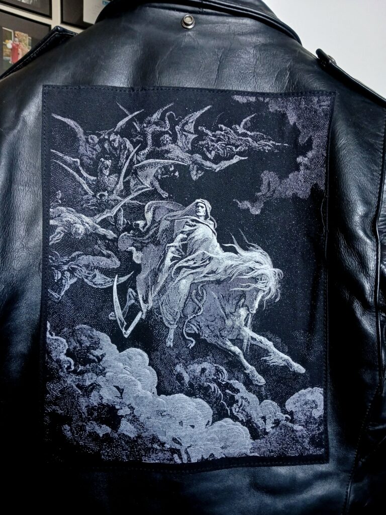 Pour finir, concernant le grand patch dorsal, je ne voulais pas qu’il soit celui d’un groupe qui dominerait tous les autres. Je n’ai pas un seul groupe préféré, mais plusieurs ! J’ai donc choisi en toute subtilité La Vision de la Mort, par ce cher Gustave Doré (1832–1883). On reste dans une vision romantique et symbolique liée au XIXe siècle, mais aussi très intemporelle. Cependant, il est à considérer que cette gravure a été utilisée par le groupe Emperor (Norvège) pour leur premier album démo intitulé Wrath of the Tyrant. Utiliser cette œuvre permet d’établir le lien, sans pour autant faire du patch dominant celui d’Emperor attitré (que j’aime beaucoup aussi !). Je tenais à conserver une neutralité pour le grand patch, et juste avoir un beau visuel qui collait au thème donné à ma battle jacket.